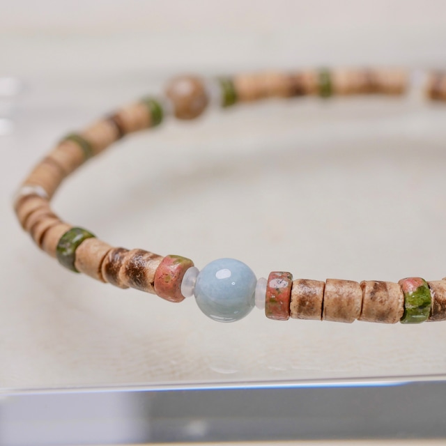 縄文ブレス ちびーなす(復刻) ちいさくてかわいらしい土偶「ちびーなす」からインスピレーションを膨らませ、誕生したシリーズ。金属フリー、天然素材のみの ユニセックスブレスです。 主役は やさしい色味の青翡翠・姫川薬石・源の石と、小さくともパワフルな組み合わせ。4mm程度のちっちゃいビーズをチビチビ連ねておりますので、とっても軽くてスリムです。 普段着にマッチするような落ち着いたカラー&着けているのを忘れそうな軽さで、肩の力を抜いて気楽に装備して頂けます。 気付いたら手放せなくなっているような使い心地の良さ、使い込むほど愛着がわいてくる素朴なかわいらしさ。リラックスして装備してみてください!