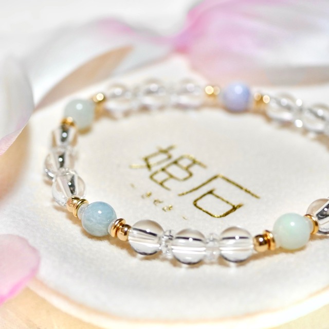 稀少な山梨県乙女水晶×あこや真珠の Xmas milky ブレスレット。 楽しみの季節をロマンティックに彩る、大人のXmasブレスです。 主役は 淡雪のような乙女水晶 6mm。産地山梨県の金櫻神社では 乙女水晶を「水の玉」として御神宝としています。国産水晶の中でも、質が良く パワー溢れる水晶です。上品なピンクホワイトのあこや真珠をふんだんに使用し、とってもゴージャスな仕上がりに!6mm以下のビーズですので、スリムで軽い着け心地です。 国産×国産、本格志向のブレスレットで特別な日をお過ごしください!