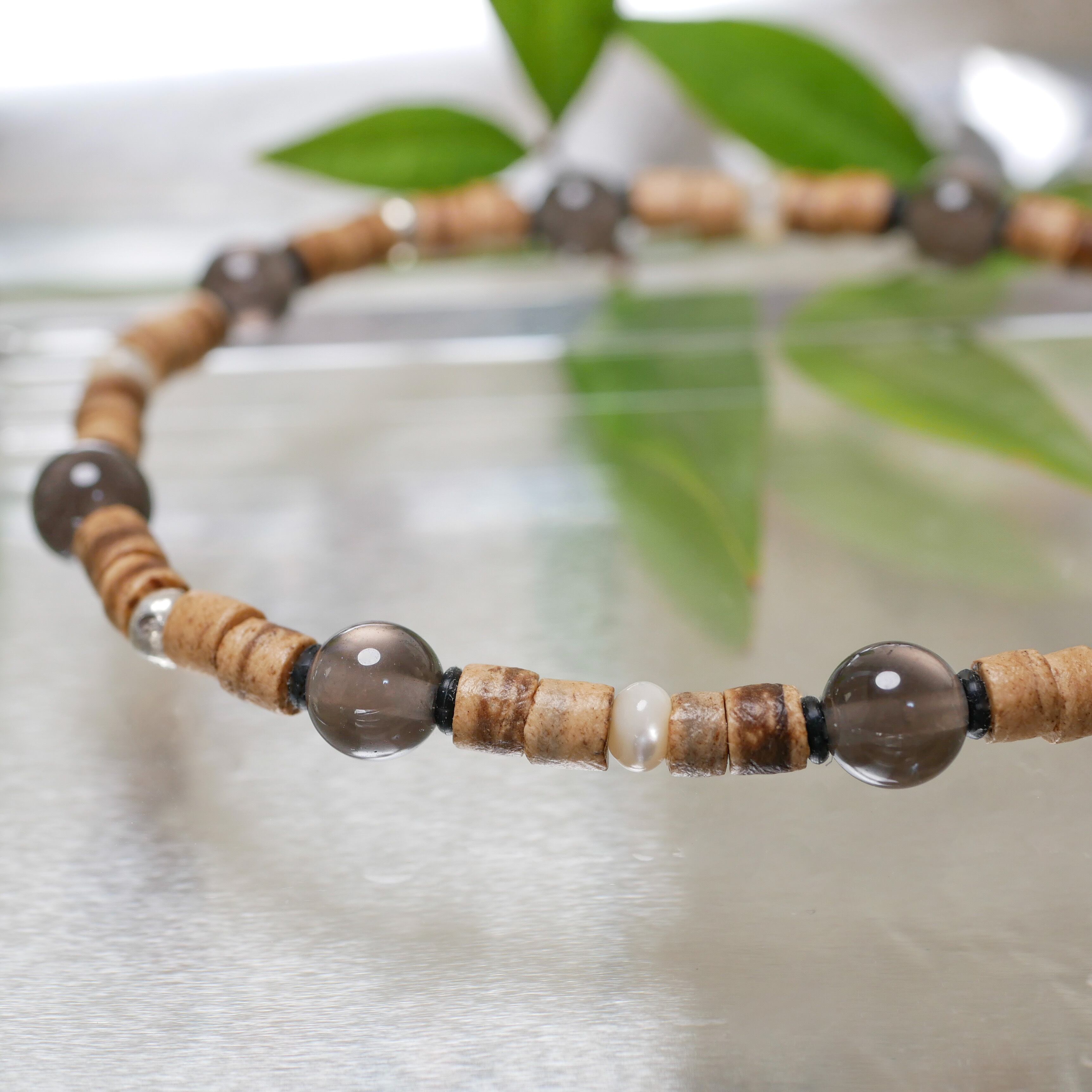 氷のような透明感が特徴的な黒曜石をメインに、マザーオブパールとカレンシルバーを組み合わせています。4mm程度のちっちゃいウッドビーズをチビチビ連ねておりますので、とっても軽くてスリムです。