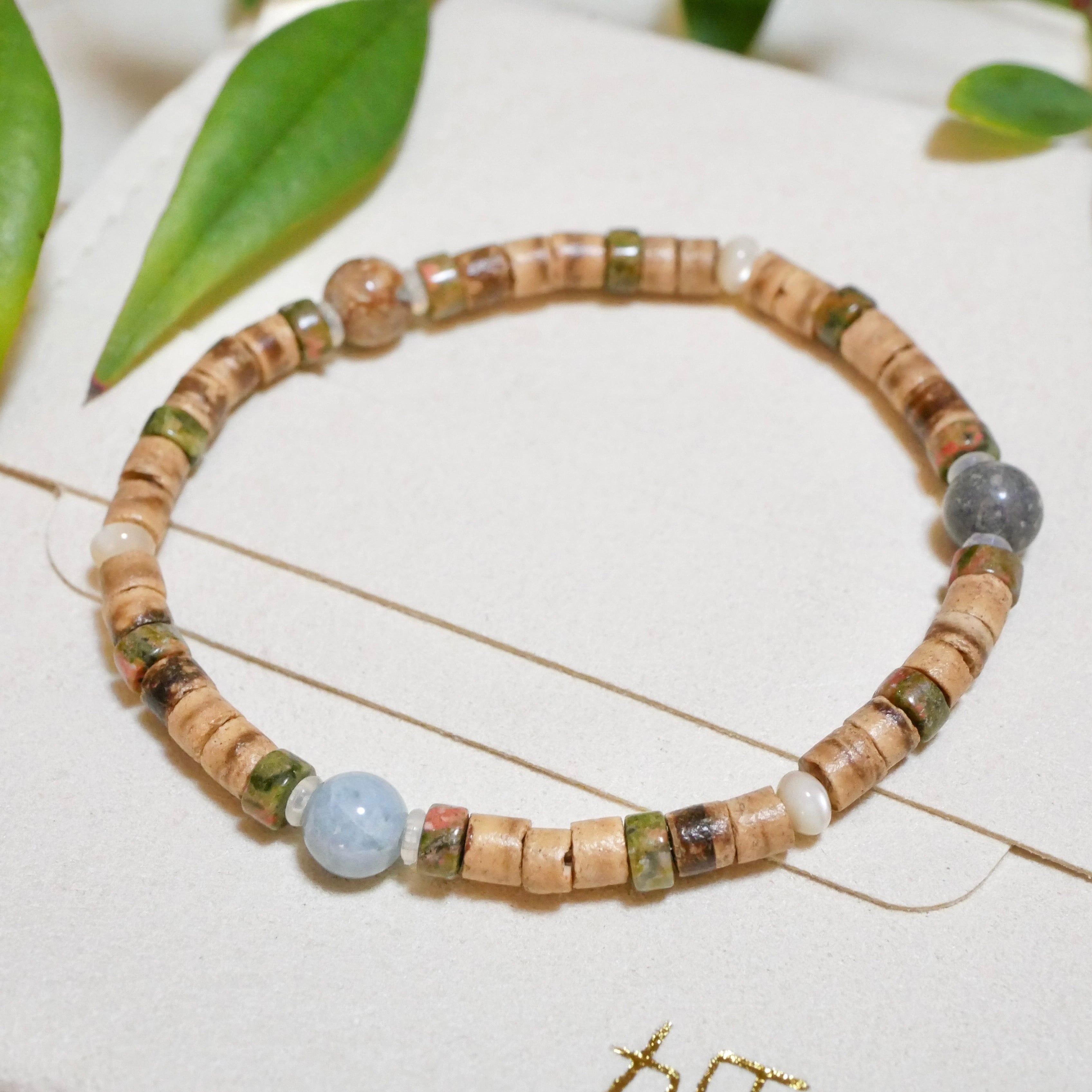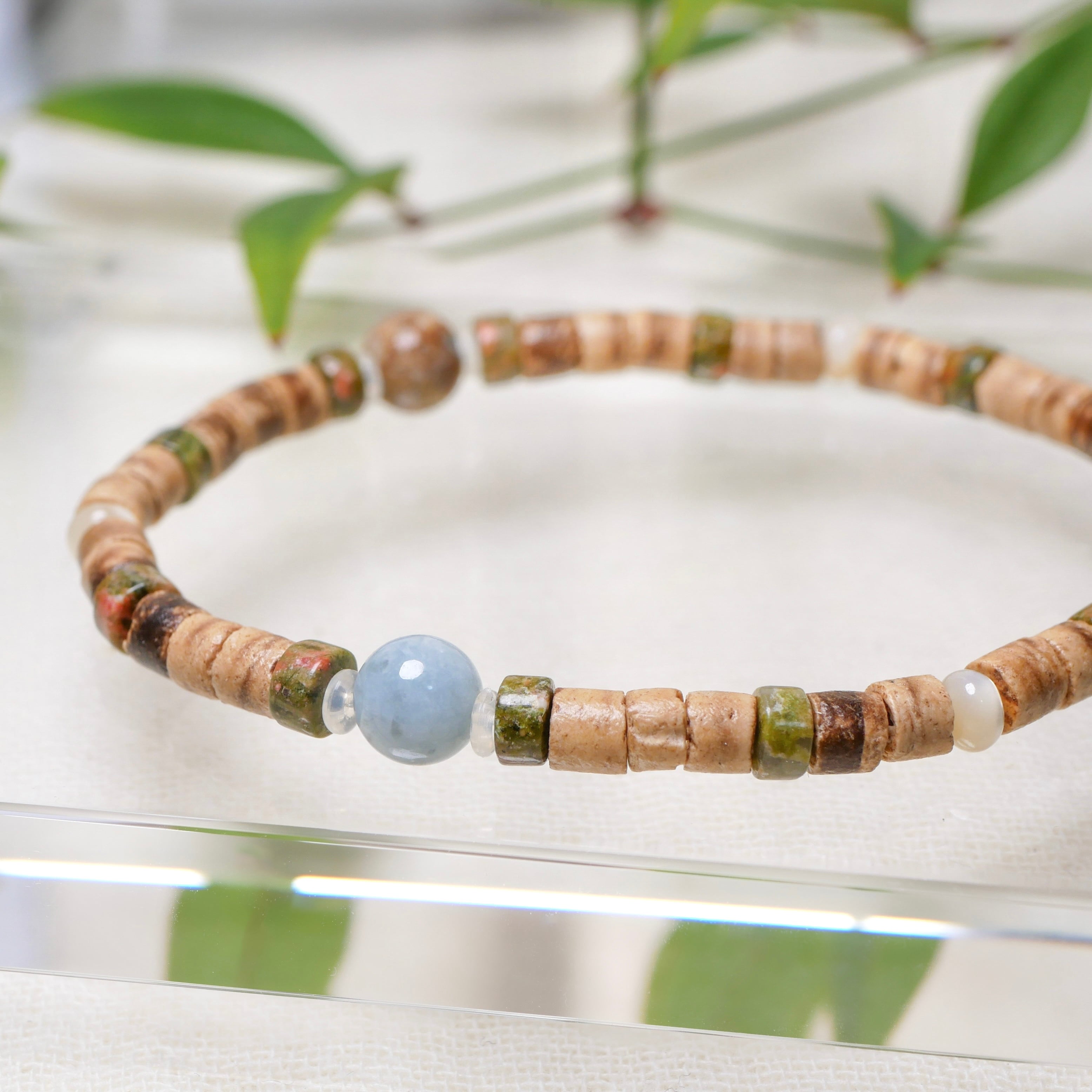 糸魚川産青翡翠6mm×1珠、姫川薬石6mm×1珠、源の石6mm×1珠、ウッドビーズ、天然石ロンデル、マザーオブパールロンデル 使用。日本製高品質ウレタン紐 使用。【tb-51】