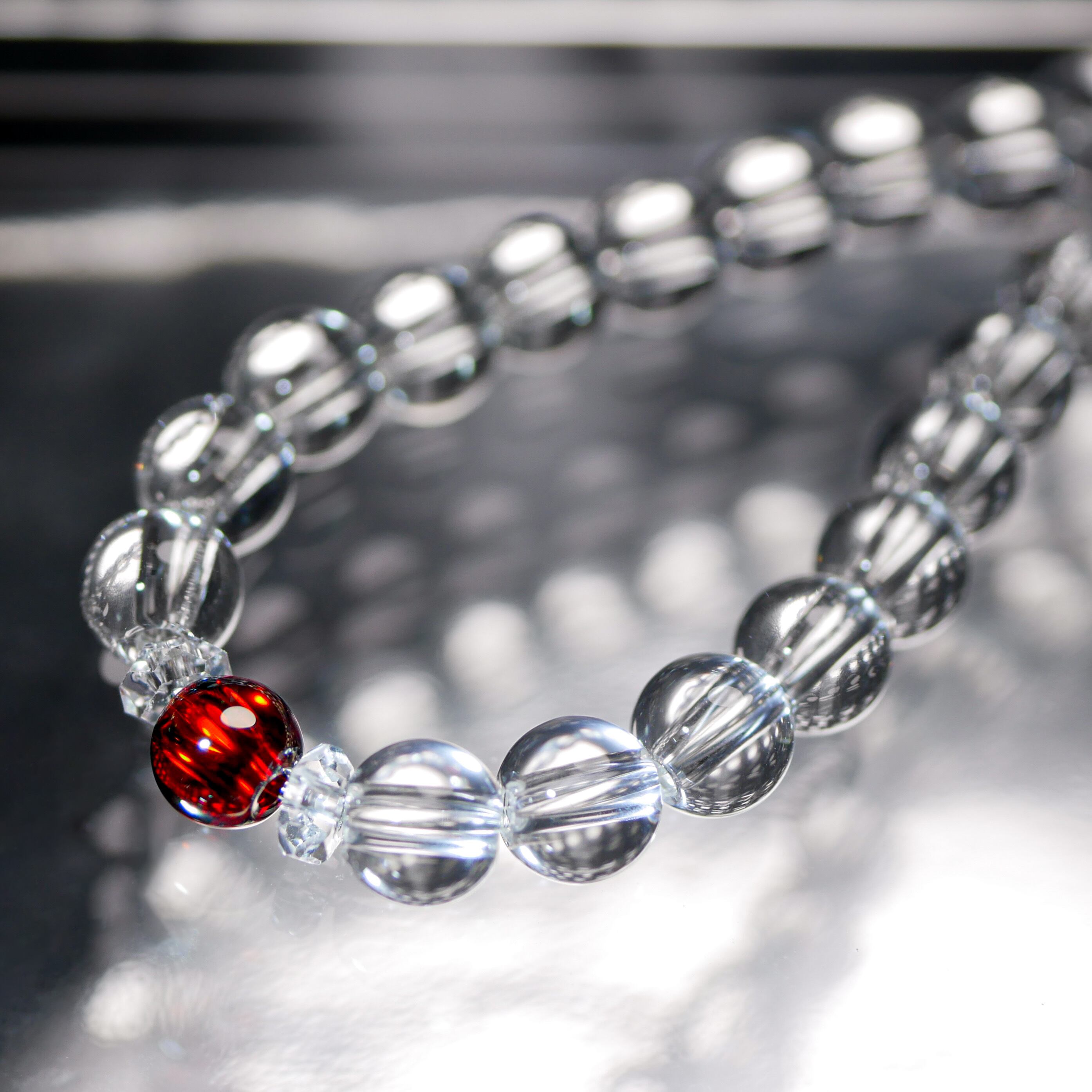 キュービックジルコニア(赤)6mm珠×1珠、国産ラボクォーツ6mm、水晶ロンデル使用。