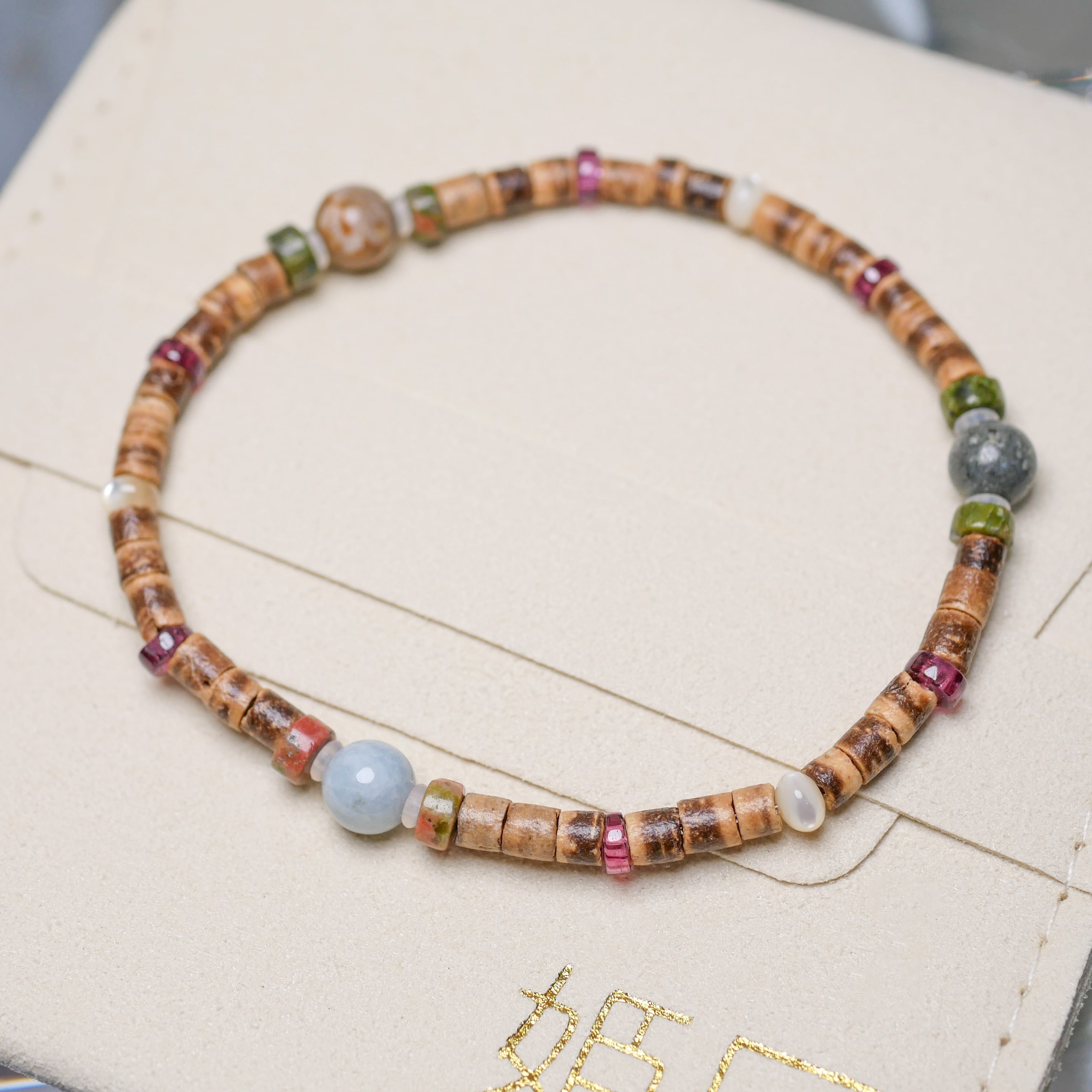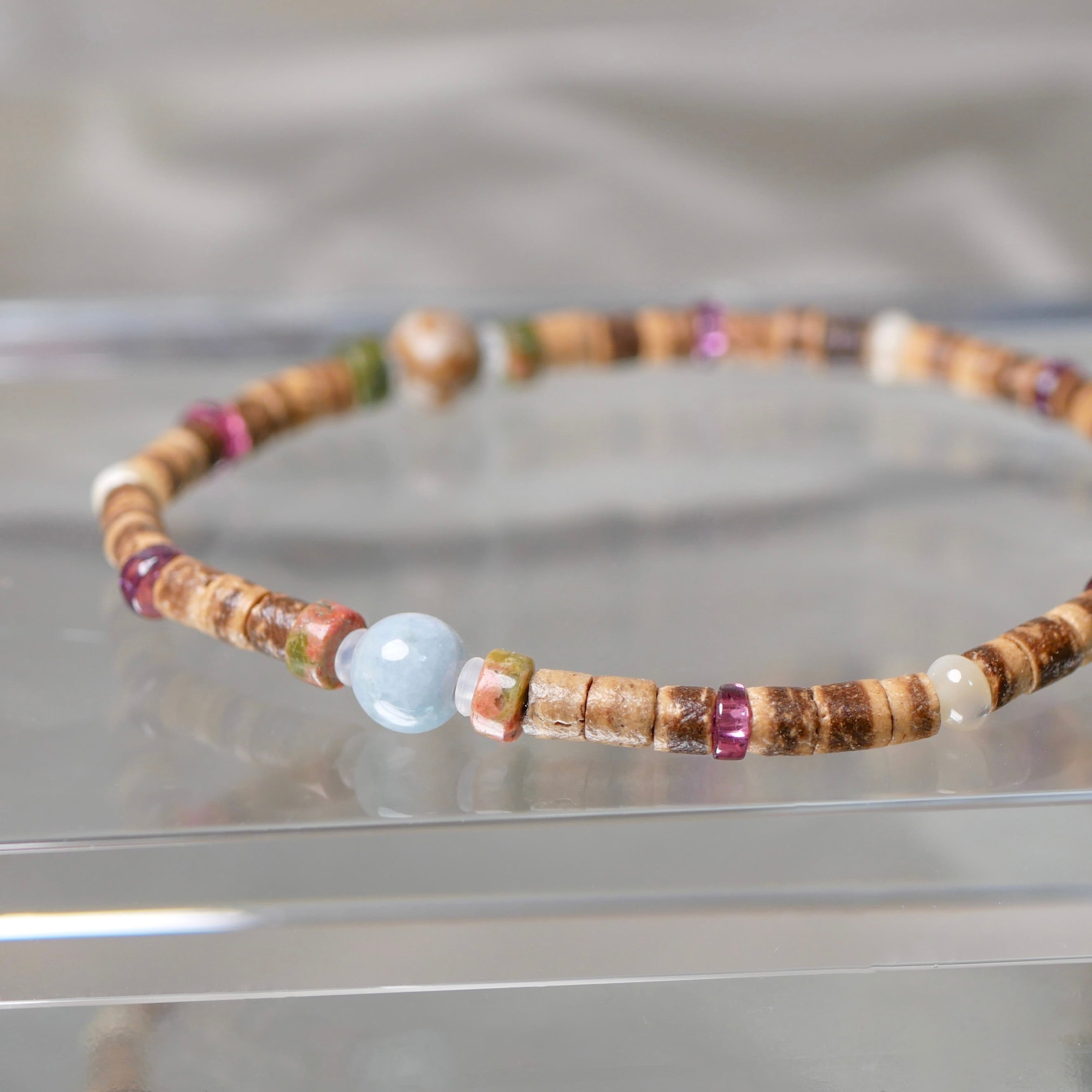 糸魚川産青翡翠6mm×1珠、姫川薬石6mm×1珠、源の石6mm×1珠、ガーネット、ウッドビーズ、天然石ロンデル、マザーオブパールロンデル 使用。日本製高品質ウレタン紐 使用。【tb-113】