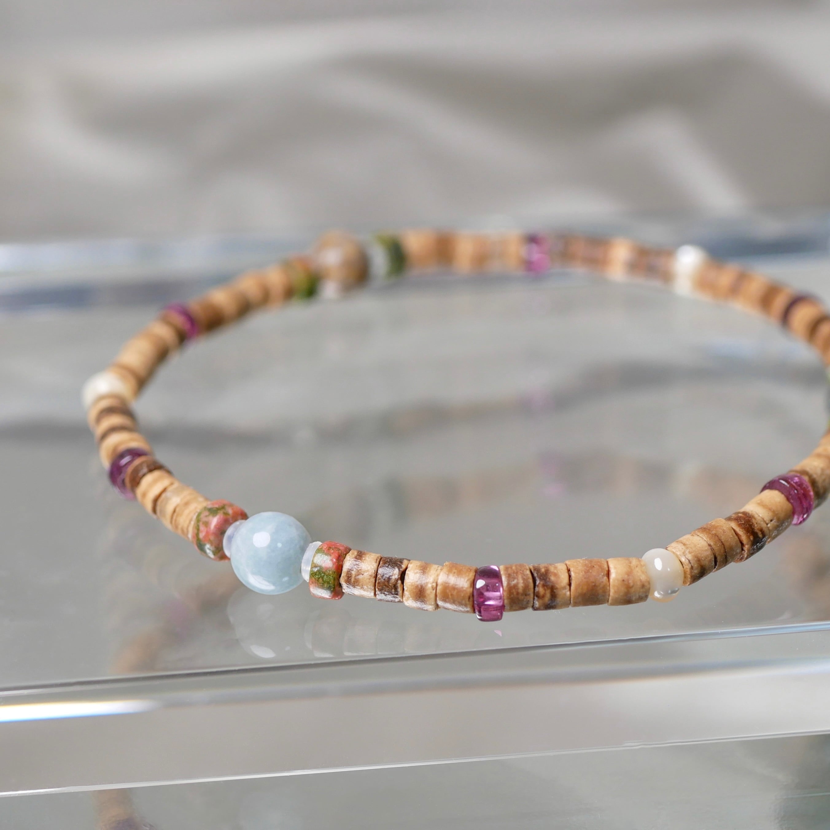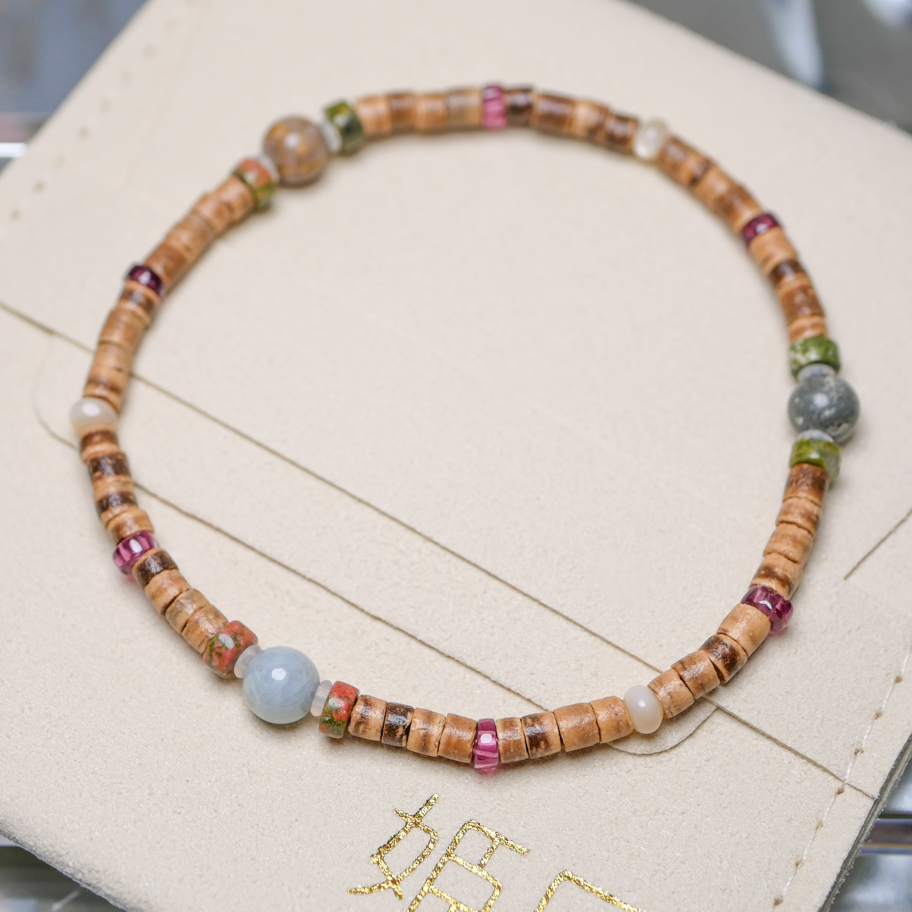 糸魚川産青翡翠6mm×1珠、姫川薬石6mm×1珠、源の石6mm×1珠、ガーネット、ウッドビーズ、天然石ロンデル、マザーオブパールロンデル 使用。日本製高品質ウレタン紐 使用。【tb-114】