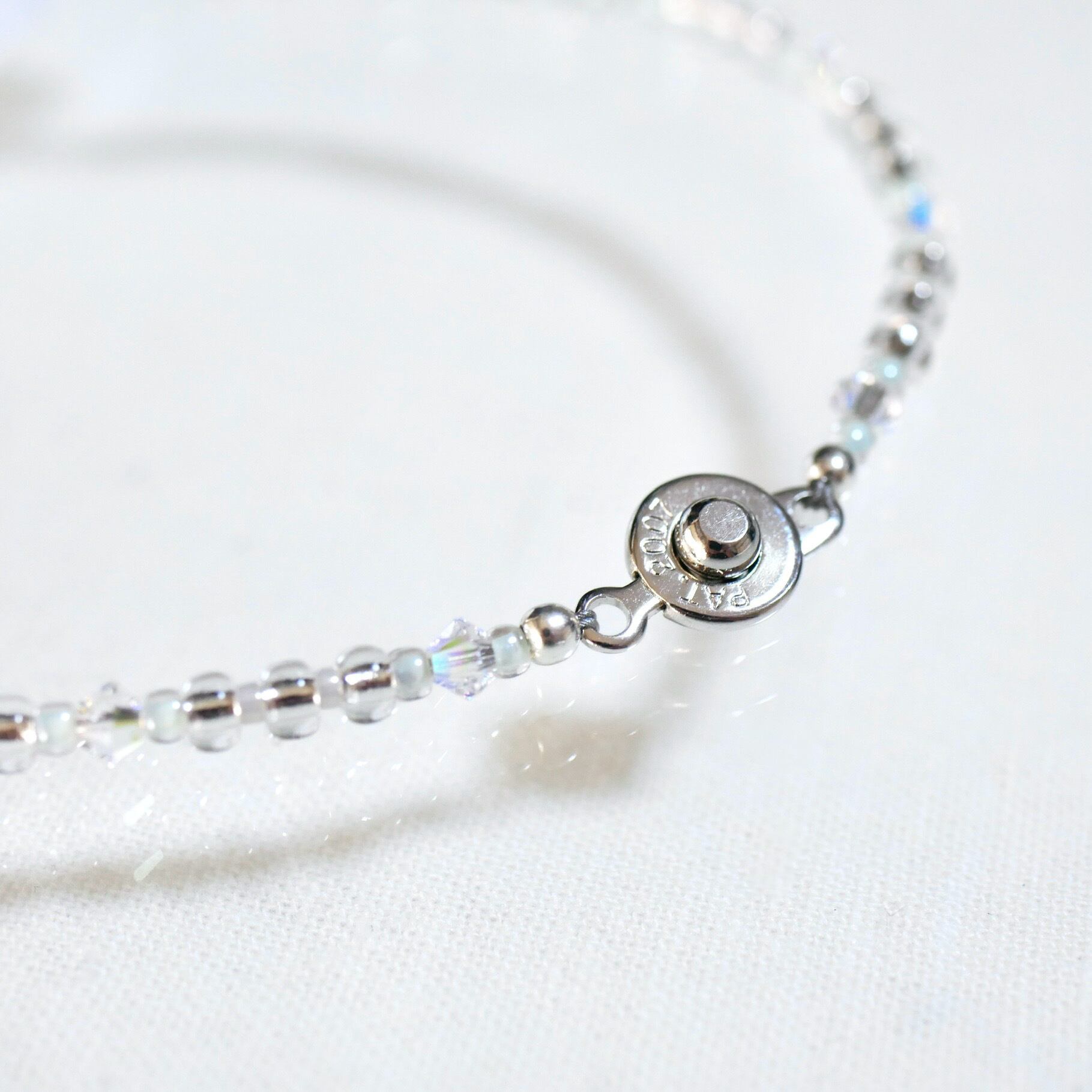 とっても細くて控えめなブレスですが、太陽光下でみるとひんやりと煌めきます。日本製の極小ビーズをちらちらと繋げ、スワロフスキーをちりばめております。2mm~4mm程度のビーズが主ですので、スリムでとっても軽い着け心地です。